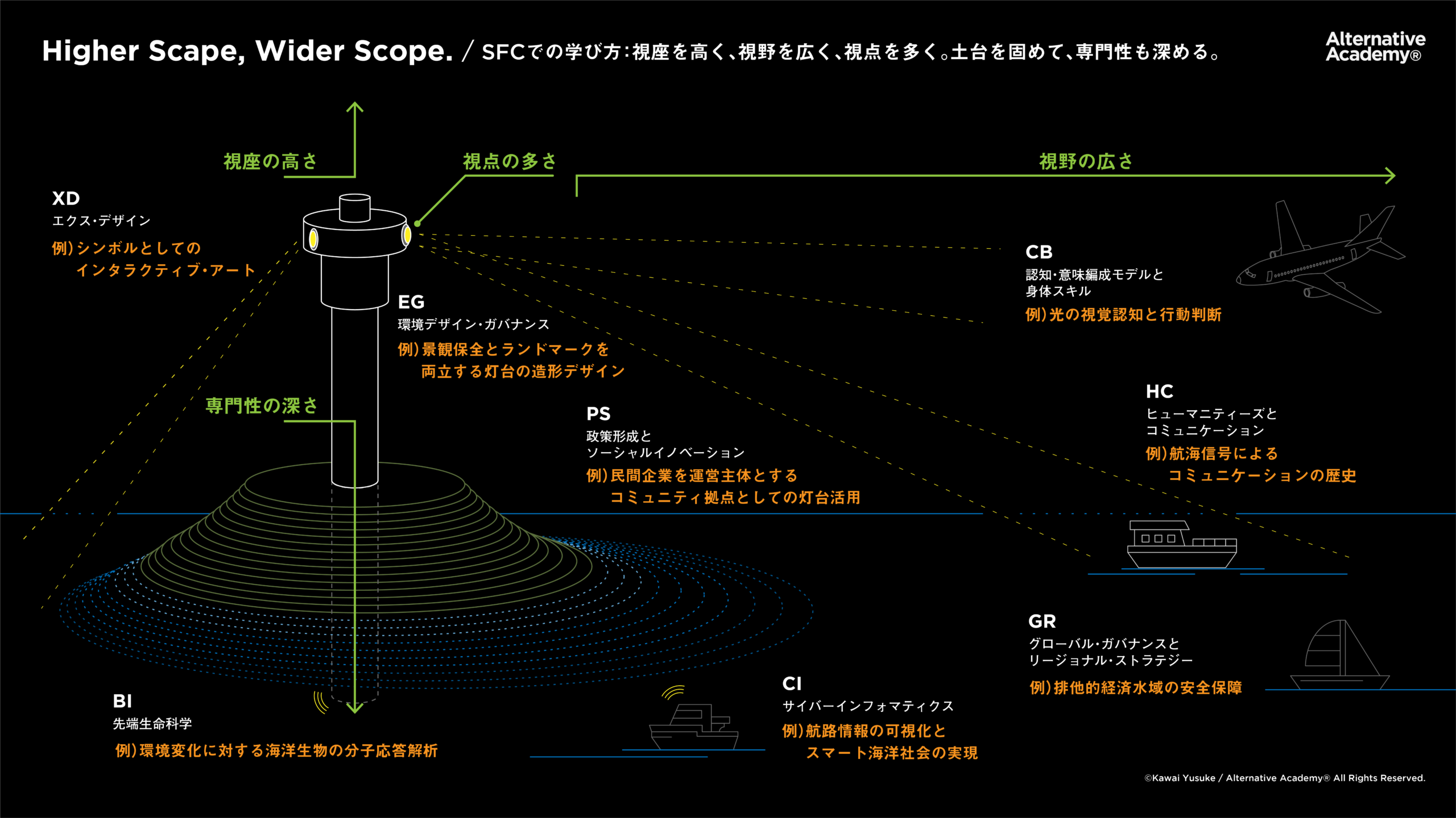 こう見ると、「灯台をつくること自体や、作ることが重要なきっかけや議論になる」のが環境情報学部寄りで、「灯台を前提として、遠方と交信したり、予測したり、航路を照らす」のが総合政策学部寄り、とも捉えることができます。灯台建設(機能の設置)が目標なのか、その後の活用法なのかの違いとも言えますね。