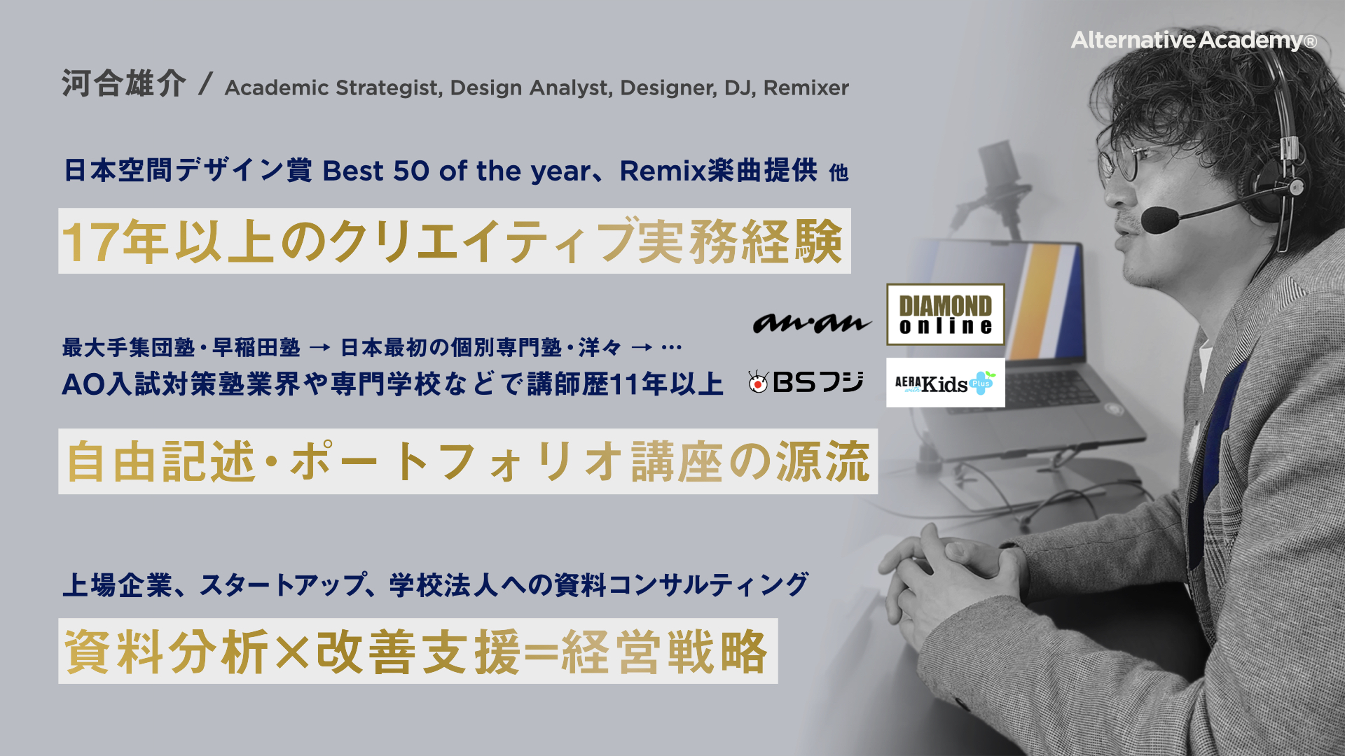 慶應SFC AO入試の重要な記事の解説は、クリエイティブ×アカデミックな受験生を支援するハイレベル総合型選抜専門塾《Alternative Academy®︎》の代表・河合雄介が担当します。