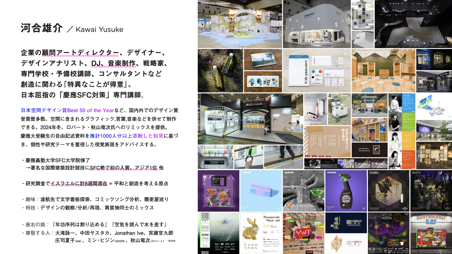 河合雄介は、慶應義塾大学SFC大学院修了後、インテリア、空間広告、グラフィック、ブランディング、サウンドなどのデザインを多数手がけてきました。2016年には、クリエイティブィレクターとして『日本空間デザイン賞 Best 50 of the year』を受賞し、20代のうちに国内最高峰の受賞経験や、学生時代からも国際コンペ入賞などの実績を挙げ続けてきました。2024年には、コメディアンの秋山竜次氏(ロバート)にリミックス楽曲を提供するなど、視覚・聴覚の情報デザインを中心に制作活動をする現役のクリエイターでもあります。