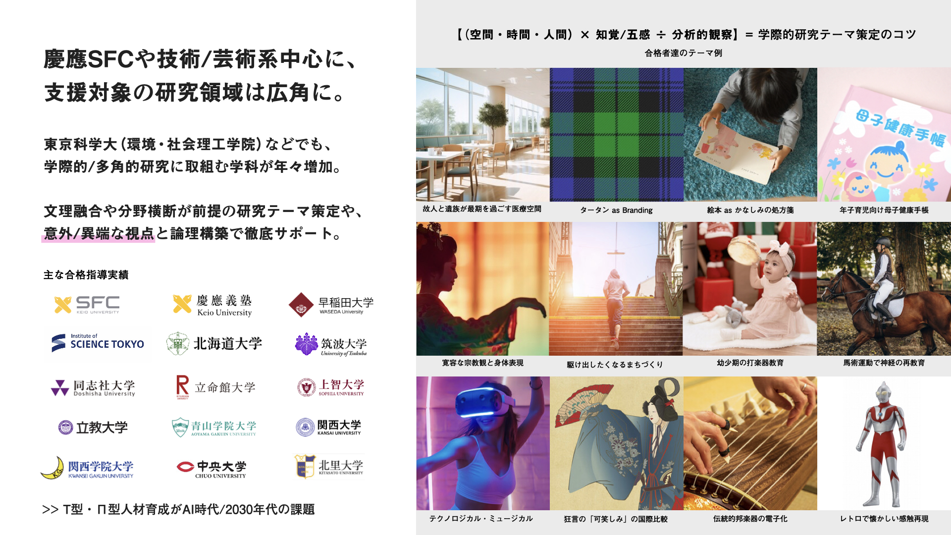 2030年代に入るよりも早く、「T型・Π型人材」の需要が高まっていますが、慶應SFCに限らず、分野横断型のカリキュラムを提供する大学*に合格・入学し、活躍するには、未来社会を見通すための「総合的+分析的」な視点・視座を持つことと、社会に提示・還元していくための「編集力+創造力」が必要不可欠です。