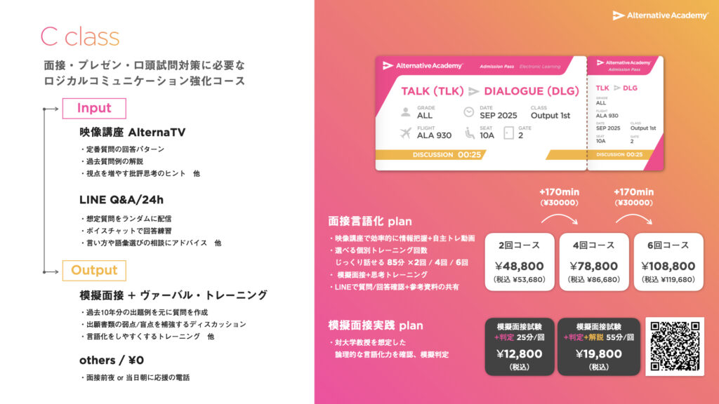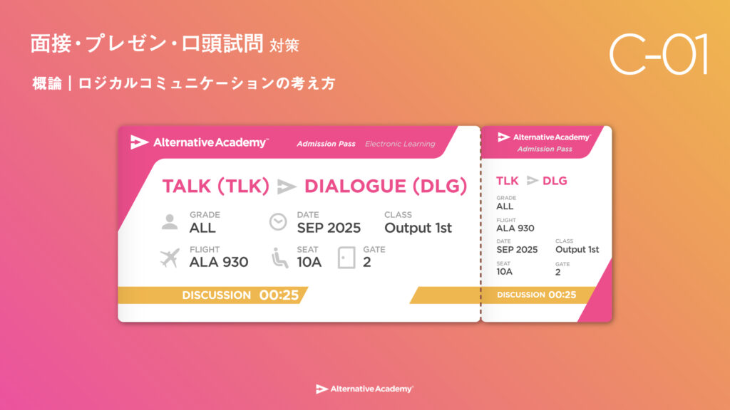 これらを網羅する講座として、「面接・プレゼン・口頭試問対策に必要な論理的思考力と言語化トレーニング」ができる【Alternative Academy®︎ C class】を2025年秋に新規リリースしました。